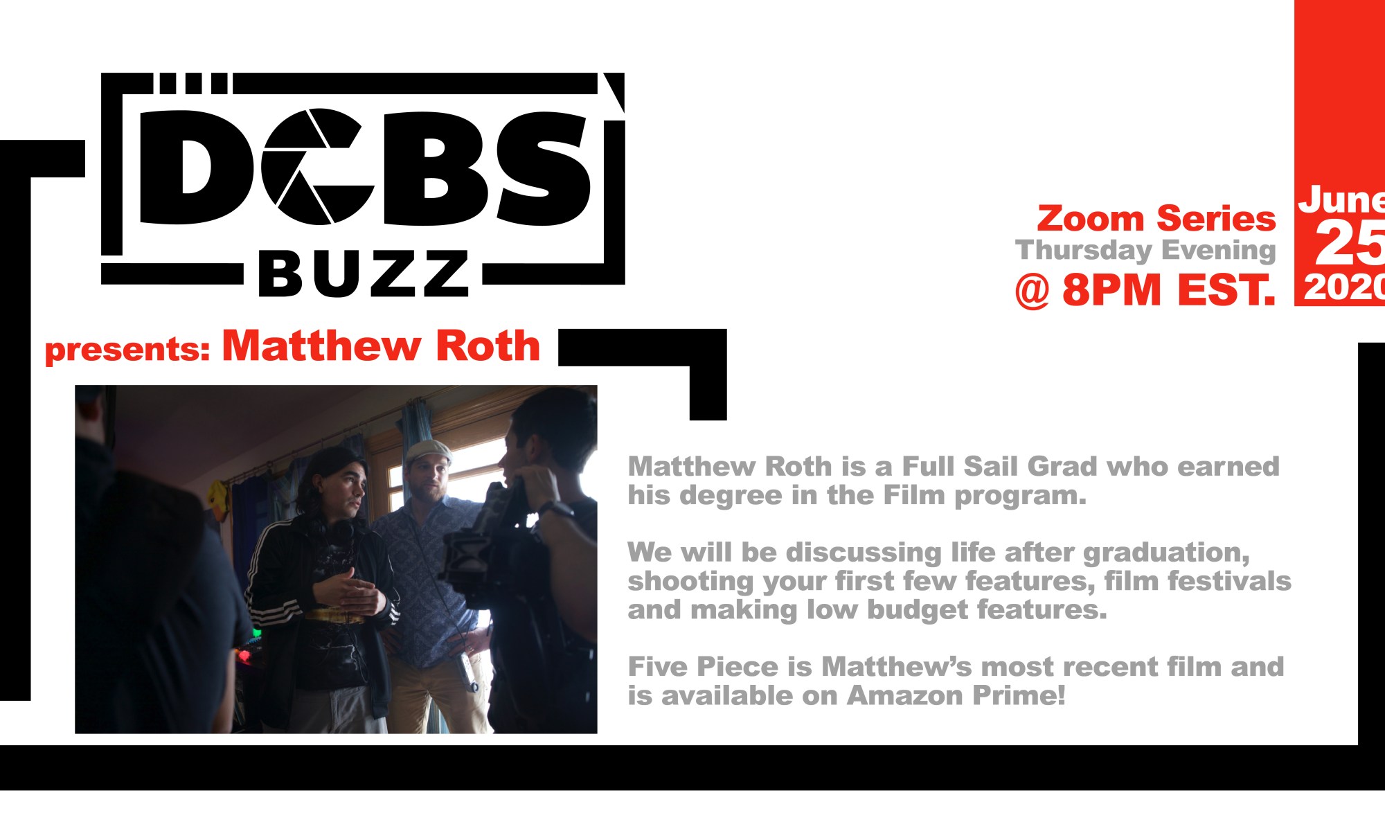 DCBS Buzz this month will be hosted by Kyle Frazer C.D for Electronic Field Production. Kyle will be interviewing with freelance writer and director and Full Sail Alumni Matthew Roth.