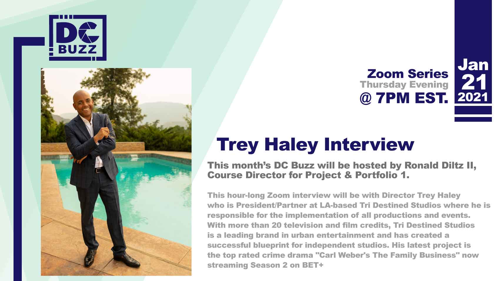 This month’s DC Buzz will be hosted by Ronald Diltz II, Course Director for Project & Portfolio 1. This hour-long Zoom interview will be with Director Trey Haley who is President/Partner at LA-based Tri Destined Studios where he is responsible for the implementation of all productions and events. With more than 20 television and film credits, Tri Destined Studios is a leading brand in urban entertainment and has created a successful blueprint for independent studios. His latest project is the top rated crime drama “Carl Weber’s The Family Business” now streaming Season 2 on BET+.
