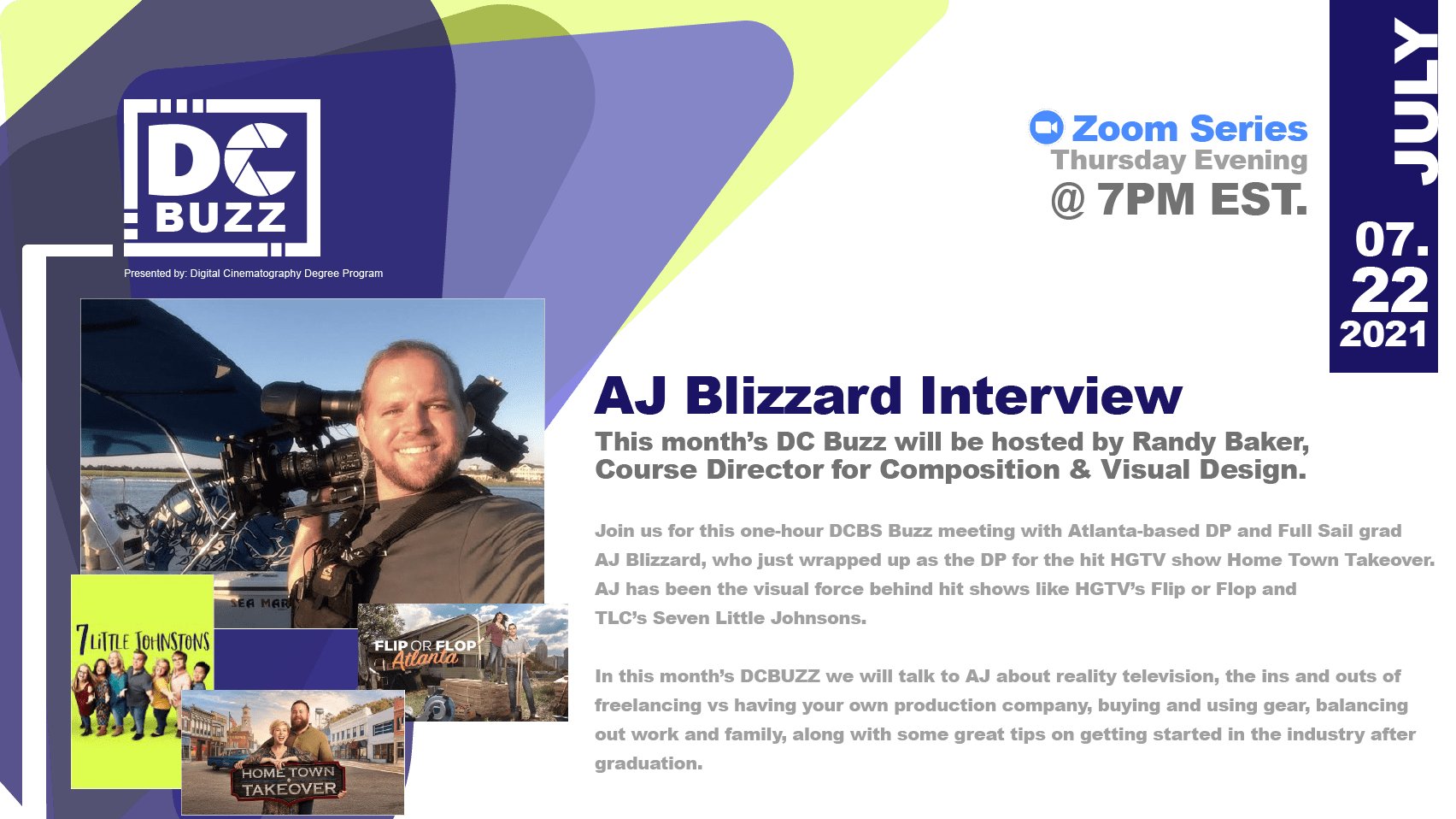 Join us for this one-hour DC Buzz meeting with Atlanta-based DP and Full Sail grad AJ Blizzard, who just wrapped up as the DP for the hit HGTV show Home Town Takeover. AJ has been the visual force behind hit shows like HGTV’s Flip or Flop and TLC’s Seven Little Johnsons.
