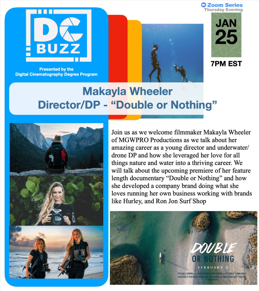 Here is the invite for this Thursday (25th) DC BUZZ with female Director/DP/Editor Makayla Wheeler, who will discuss her new feature-length documentary “Double or Nothing,” which she directed, shot, and edited.