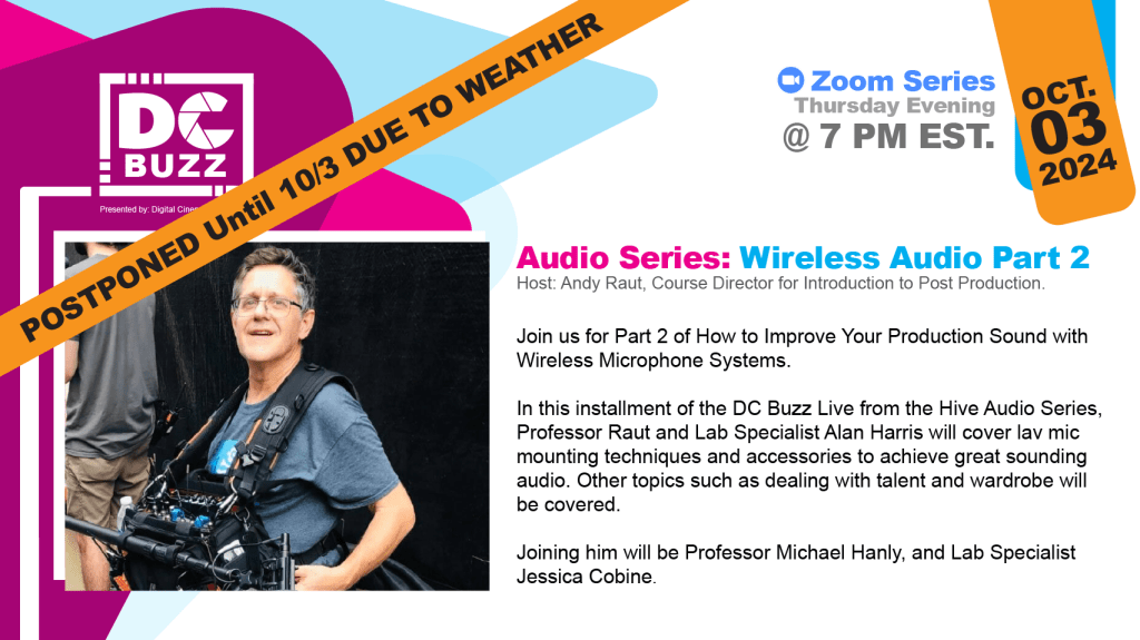 In this installment of the DC Buzz Live from the Hive Audio Series, Professor Raut, and Lab Specialist Alan Harris will discuss lav mic mounting techniques and accessories to achieve great-sounding audio. They will also discuss dealing with talent and wardrobe.