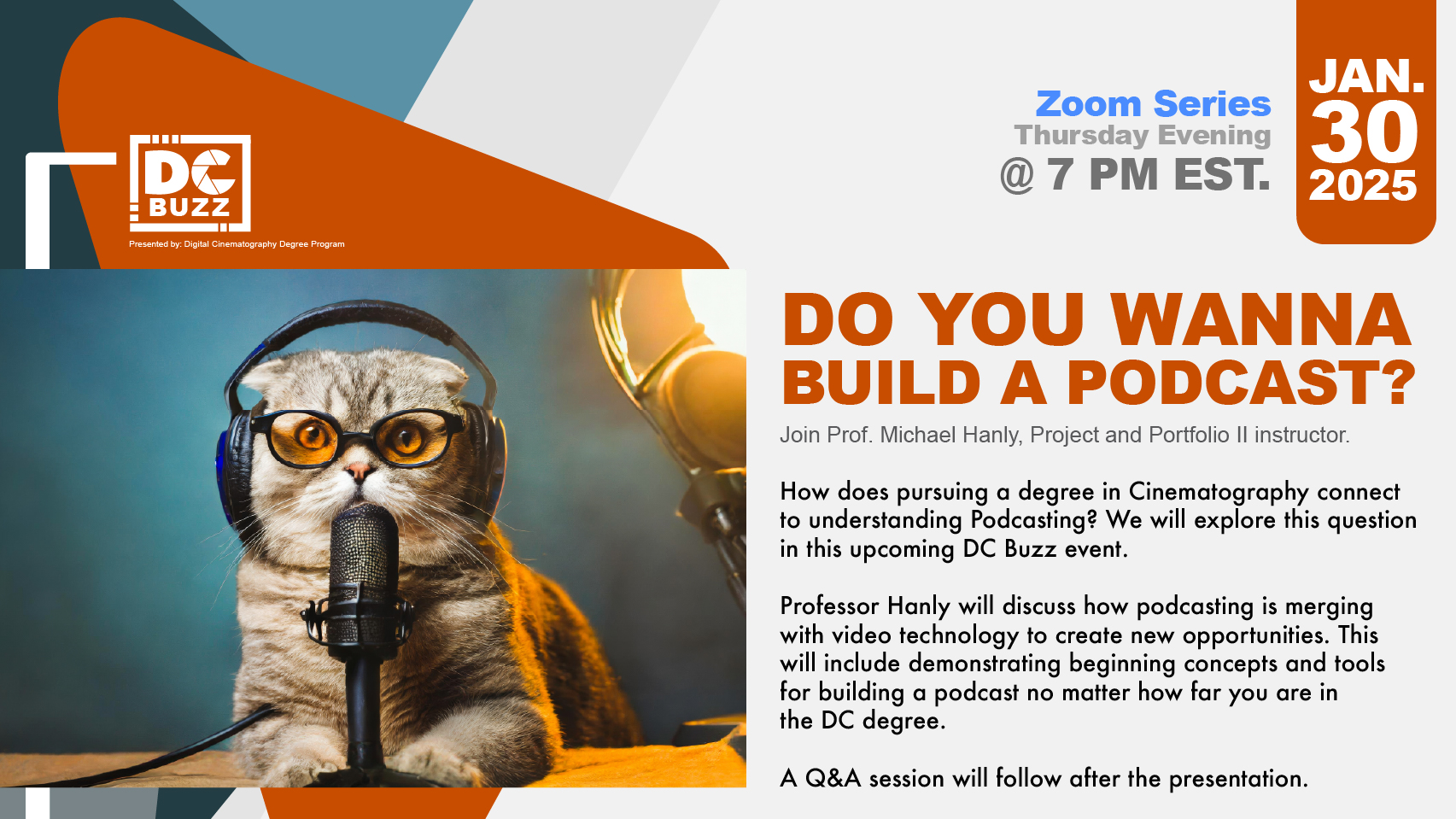 How does pursuing a degree in Cinematography connect to understanding Podcasting? We will explore this question in this upcoming DC Buzz event. Professor Hanly will discuss how podcasting is merging with video technology to create new opportunities. This will include demonstrating beginning concepts and tools for building a podcast no matter how far you are in the DC degree.