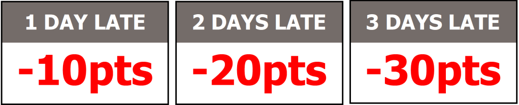 This penalty structure below applies to assignments with due dates in weeks 1 through 3 of class: